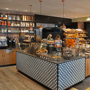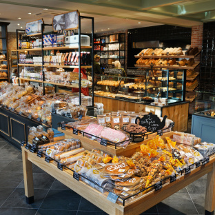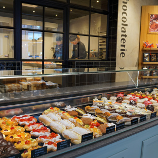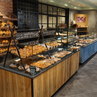 Authentieke materialen in een eigentijds jasje zorgen voor een warm winkelhart in het mooie Friese Kollum. In het zicht van de klant wordt er gebakken in de grote vloeroven en achter de gebakcounter kan men zien hoe de verschillende taartjes en chocolade tot stand komen. Een grote wandschildering met daarop de plaatselijke rivier en kerktorens maken het geheel af.